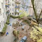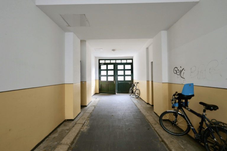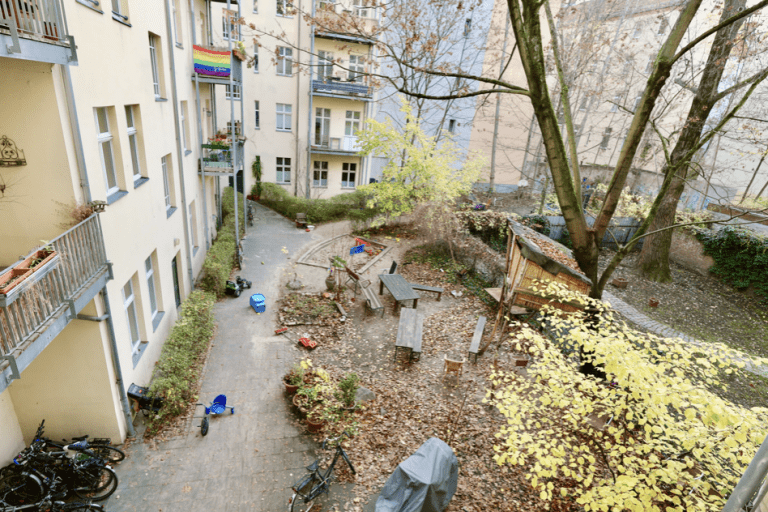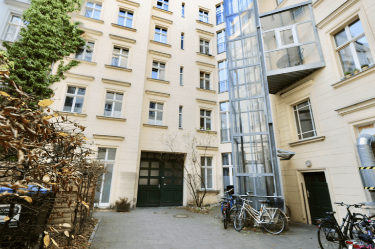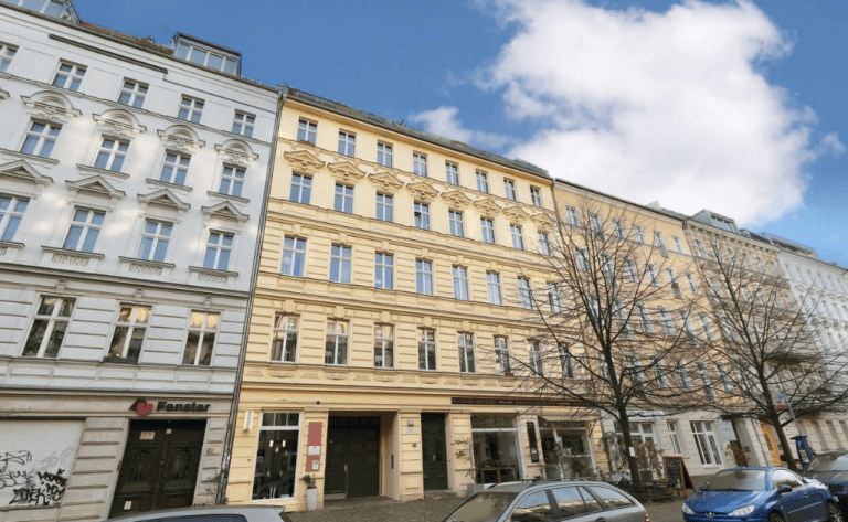 Das Gebäude liegt in einer Seitenstraße, im beliebten Kollwitzkiez, nur einen Katzensprung vom Kollwitzplatz entfernt. Hier haben sich einige Berliner und Neu-Berliner von dem Zauber des Viertels begeistern lassen und genießen das Kiezleben.