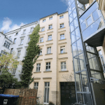 Es wurden nachträglich innenhofseitig ein moderner Glasfahrstuhl und neue Balkonanlagen angesetzt.