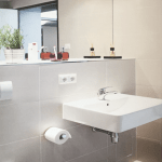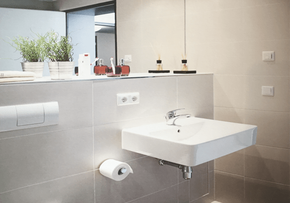 Die hellen Bodenfliesen und zwei bodentiefe Fenster schaffen eine klare und helle Atmosphäre. Die Wände sind gespachtelt.
