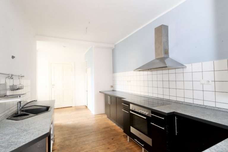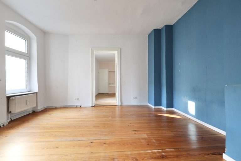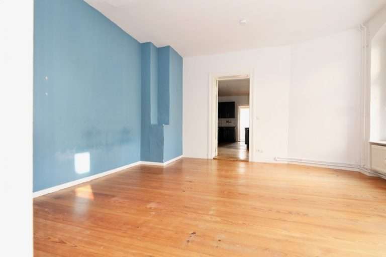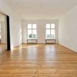 Das Wohnzimmer und das Esszimmer sind durch einen offenen Durchgang miteinander verbunden und schaffen eine einladende Atmosphäre für ein geselliges Beisammensein. Die großzügige Küche erstreckt sich in den Seitenflügel, das sogenannte Berliner Zimmer. Von hier sind zwei weitere Räume begehbar.