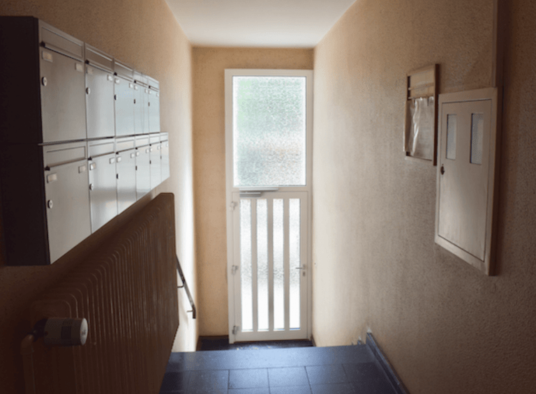 Die Wohnung befndet sich in dem dritten Obergeschoss eines Mehrfamilienhauses aus dem Jahr 1965. Die Einheit ist in dem Vorderhaus gelegen.