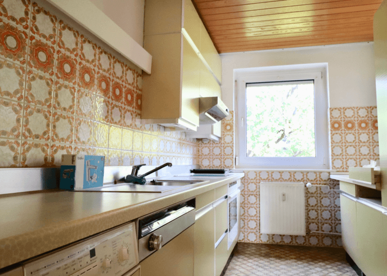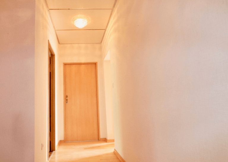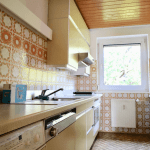 In dem Flur und dem Wohnzimmer ist ein heller Laminatboden verlegt. Die Küche und das Badezimmer sind gefliest. Die Decken der Wohnung sind teilweise vertäfelt und sorgen für einen individuellen Charme.