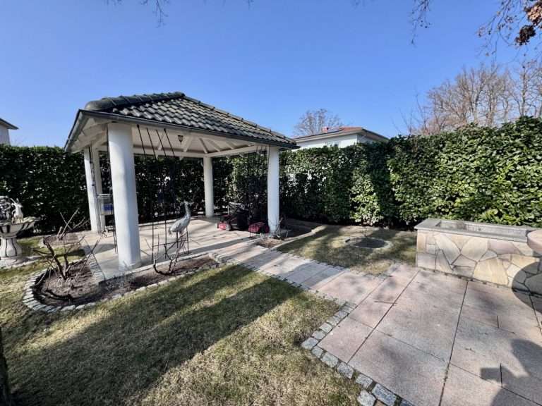 Das Haus ist von einladenden Terrassen sowie einem gepflegten Garten mit einer charmanten Pergola umgeben, die zum Entspannen im Freien einlädt.