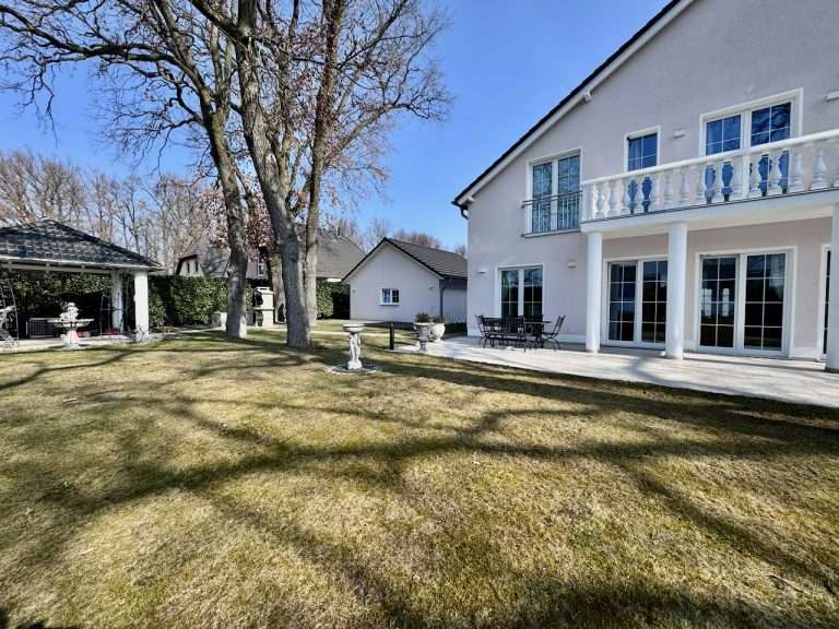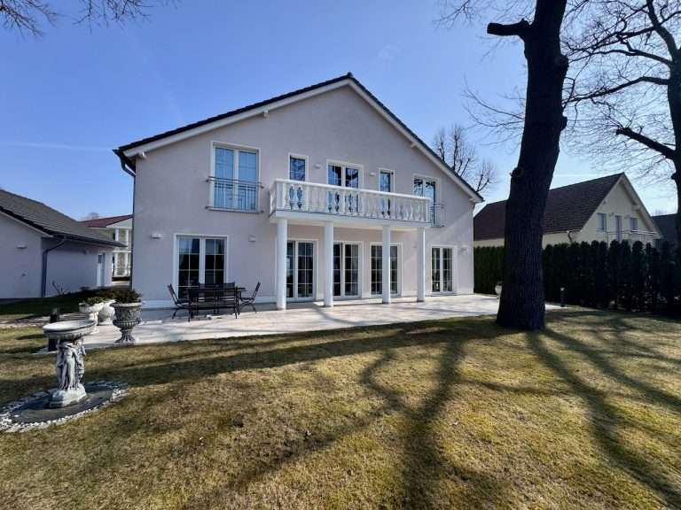Die Villa kombiniert klassische Design-Elemente wie Säulen und Balustraden mit modernen, großen Fensterflächen. Ein perfektes Zuhause für eine Familie, die sowohl Wert auf einen repräsentativen Stil als auch auf Komfort legt.