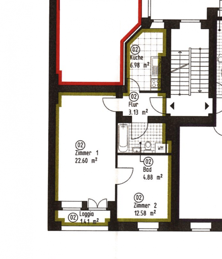 Die Wohnung befindet sich im ersten Obergeschoss des Vorderhauses und verfügt über eine Wohnfläche von ca. 51,58 m². Diese verteilt sich auf einen Flur, eine Küche, ein Wannenbad und zwei Zimmer. Vom Wohnzimmer ist die Loggia zu begehen.