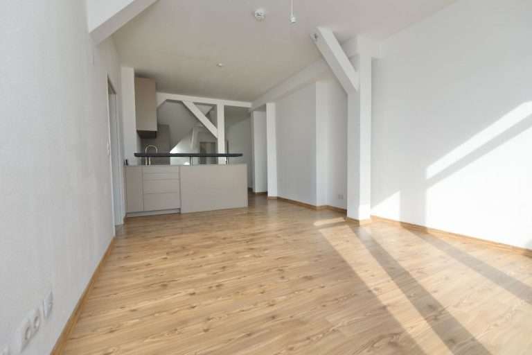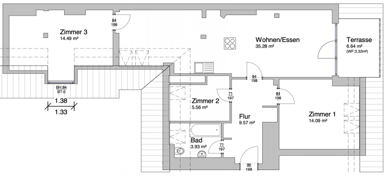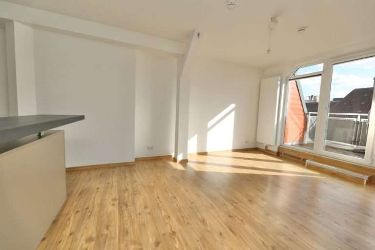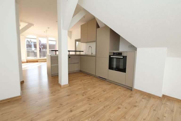 Eine Wohnfläche von ca. 86,24 m² verteilt sich auf einen Eingangsbereich mit Platz für die Garderobe und Stauraum; ein Badezimmer, ausgestattet mit einer Badewanne und einem Waschmaschinenanschluss; einen offen gehaltenen Wohn-/Essbereich mit einer hochwertigen, maßangefertigten Einbauküche sowie zwei große und ein kleineres Zimmer, die sich als Schlafzimmer, Gästezimmer oder Arbeitszimmer eignen. Vom Wohnzimmer aus ist der Zugang zu der idyllisch im Dachbereich eingebetteten Terrasse möglich, die Platz zum Entspannen oder für gesellige Zeiten bietet.