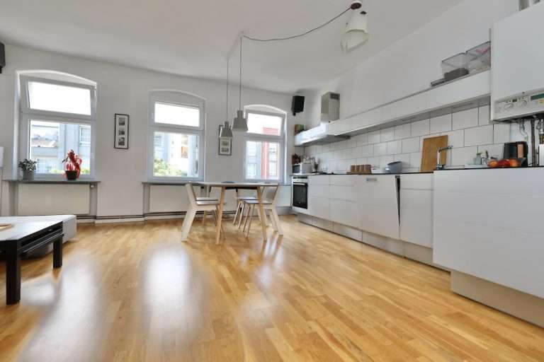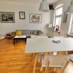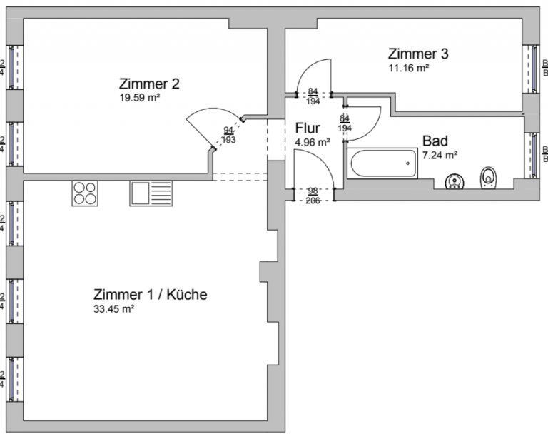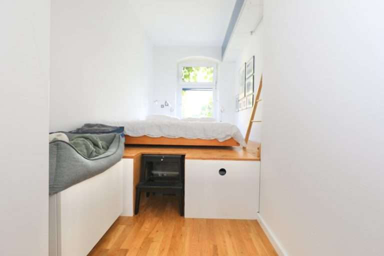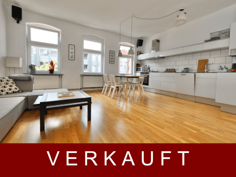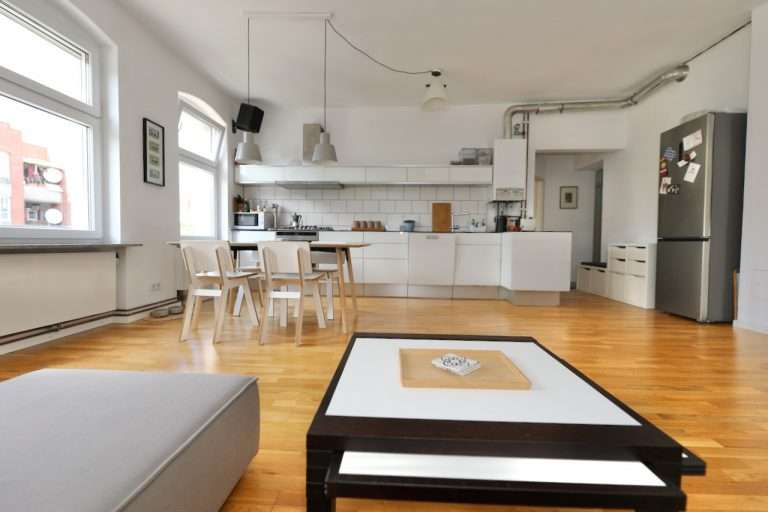 Eine Wohnfläche von ca. 76,40 m² verteilt sich auf einen Eingangsbereich, zwei Schlafzimmer, ein tagesbelichtetes Badezimmer mit Badewanne und Waschmaschinenanschluss sowie einen loftartigen Wohn-/Essbereich mit offener Küche. Die moderne und stilvolle Einbauküche wurde 2008 von einem Tischler angefertigt und verfügt über einen Gasherd.