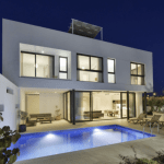 Im Obergeschoss ist ein weiteres Schlafzimmer mit eigenem Balkon und Blick auf den Pool sowie einem angrenzenden Badezimmer. Zwei weitere Schlafzimmer teilen sich ein Familienbad. Über eine Außentreppe ist der große Dachgarten zu begehen, der mit einem Grill und einer Bar ausgestattet ist.