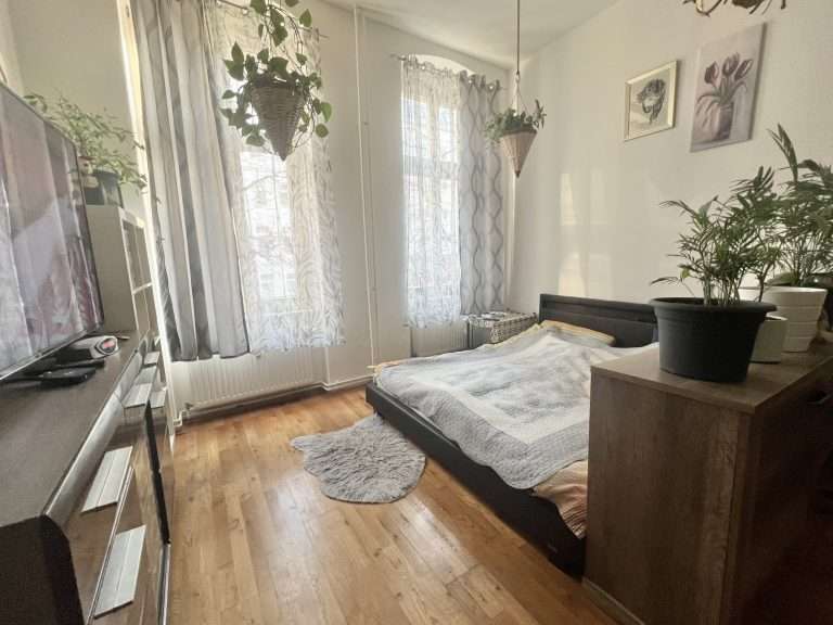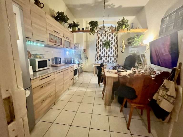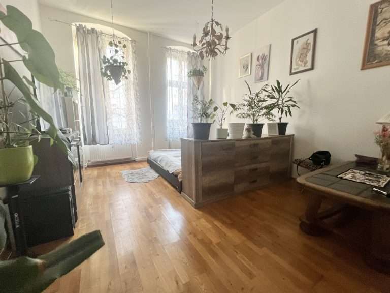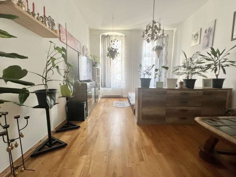Die Wohnräume sind ausgestattet mit Holzdielen, Parkettboden und Laminatboden. Die Küche und das Badezimmer sind hell gefliest, die Wände tapeziert, und die Deckenhöhe beträgt ca. 3,30 m.