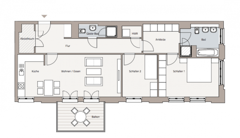 Auf der rechten Seite des Eingangsbereiches befindet sich ein großzügiger Abstellraum, der genügend Platz für eine Garderobe bietet. Rechts neben dem Abstellraum befindet sich der der Wohn-/ Essbereich, der mit einer offenen Küche ausgestattet ist und Zugang zum südlich ausgerichteten Balkon bietet. Hier kann man an warmen Sommertagen den Abend ausklingen lassen oder am Wochenende frühstücken.