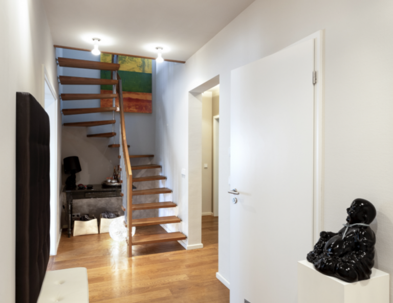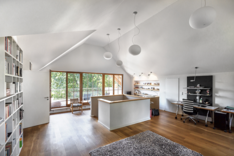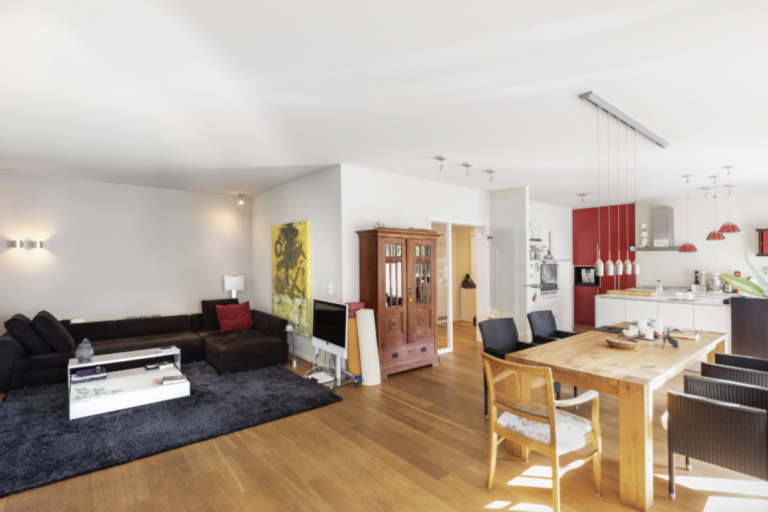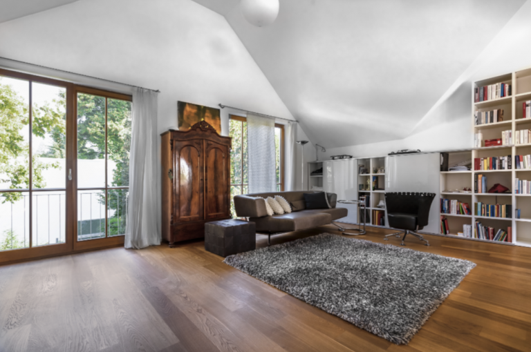Die 4- bis 5-Zimmer-Wohnung verteilt sich auf ca. 198m² im ersten Obergeschoss sowie dem Dachgeschoss und ist bequem mit einem gläsernen Fahrstuhl zu erreichen.