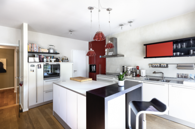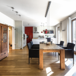 Im ersten Obergeschoss gelangt man durch das Entrée in den großen Wohn-/Essbereich mit offener Küche. Die voll ausgestattete und hochwertige Einbauküche mit Markeneinbaugeräte ist großartig geplant und lässt keine Wünsche offen. Der Wohn-/Essbereich bietet genügend Raum für einen Essbereich, einen etwas separierten Wohnbereich und direkten Zugang zum sonnigen Balkon.