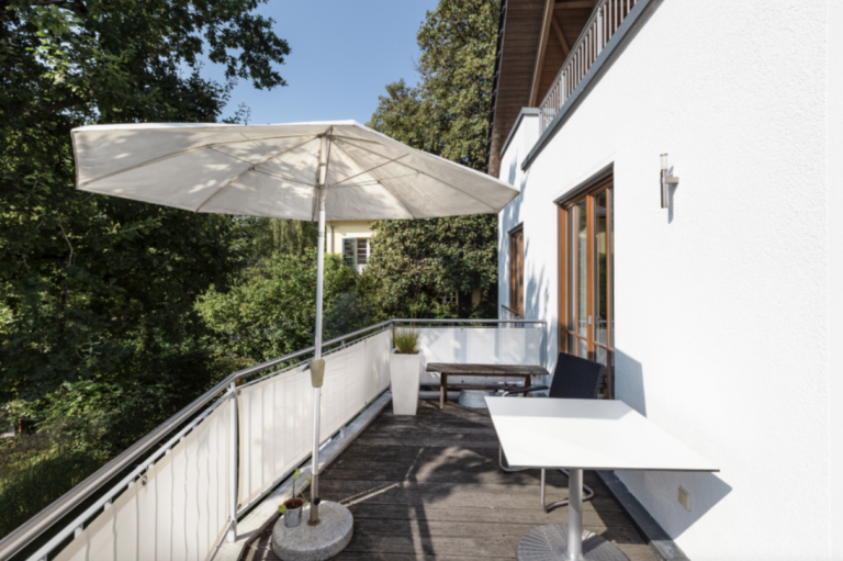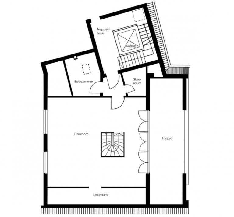 Eine modere Holztreppe verbindet die untere Ebene mit der oberen Ebene, wo sich der sogenannte „Chillroom“ befindet. Dieser hat eine Wohnfläche von ca. 52 m² und direkten Zugang zu einer traumhaften Loggia, welche sich über die gesamte Länge des Raumes erstreckt. Ein Abstellraum, ein praktischer Stauraum und ein Duschbad befinden sich ebenfalls auf dieser Ebene.