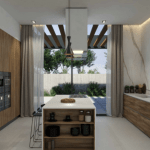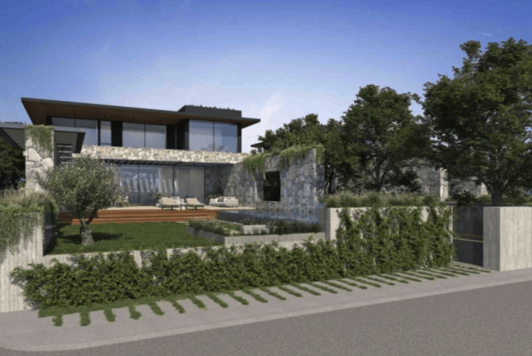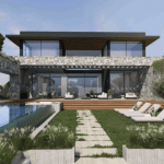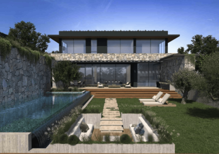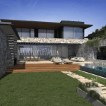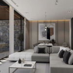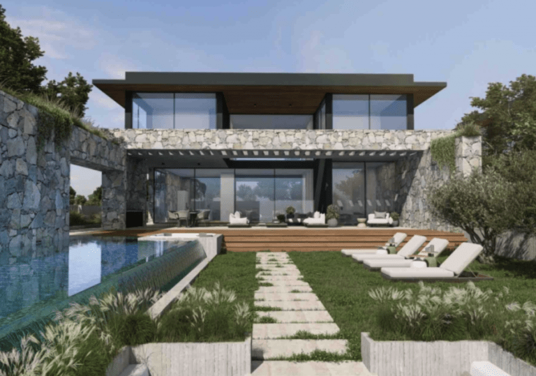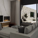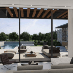 Natürliche Materialien, Steinstrukturen und blasse Farben unterstreichen die naturbelassene Umgebung, die die Villa umgibt.