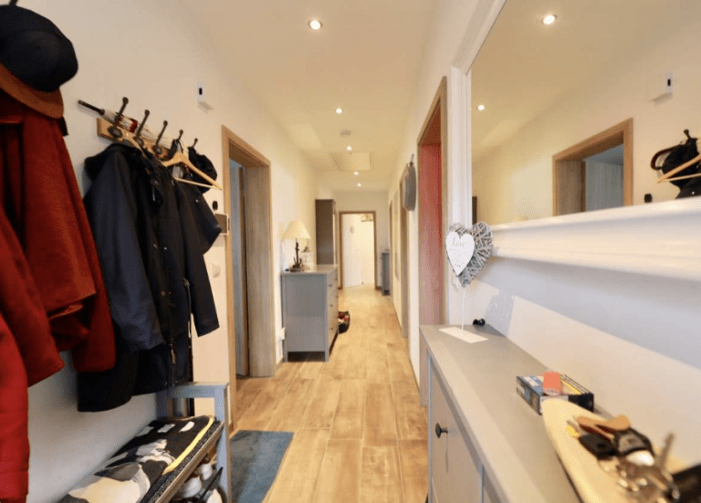 Im Hauswirtschaftsraum ist die Technik des Hauses untergebracht. Hier findet neben der Waschmaschine und dem Trockner eine Gasbrennwert-Therme mit Solar Platz, die das Haus über eine Fußbodenheizung beheizt und mit Warmwasser versorgt. Neben einem Wasserenthärter gibt es im Garten eine Zisterne, die Wasser für die automatische Bewässerung des Gartens liefert.
