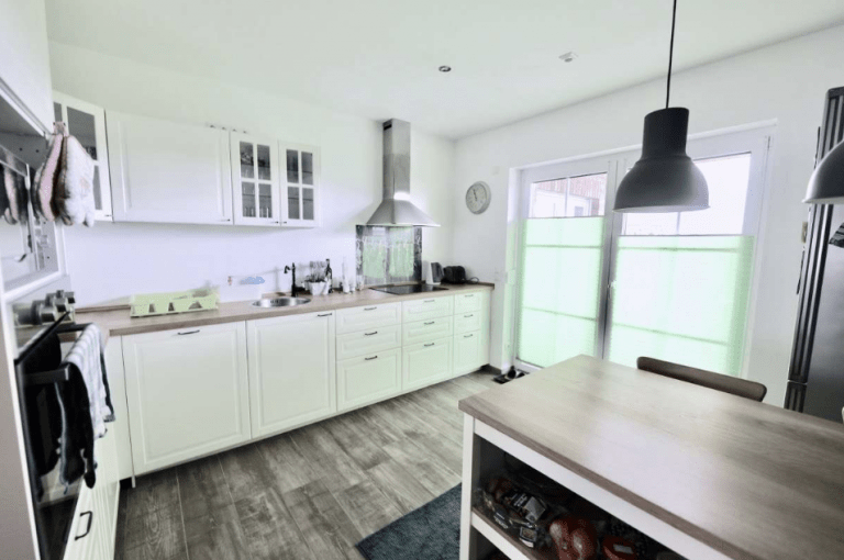 In der geräumigen Küche ist neben der Einbauküche auch Platz für einen Essbereich. Die ca. 25 m² große Terrasse (überdacht ca. 12 m²) ist sowohl über das Wohnzimmer als auch über die Küche zugänglich. Auf Wunsch kann die Einbauküche mit Geräten übernommen werden.