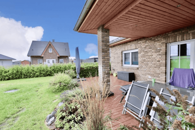 Das ca. 597 m² große Grundstück wurde 2017 mit einem modernen Winkel-Bungalow von ca. 108 m² Wohnfläche bebaut.