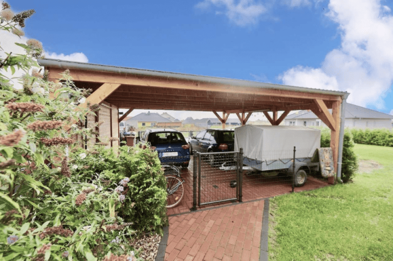 Zwei Autos finden unter dem Doppel-Carport Platz. Ein Elektroanschluss ist am Carport vorhanden, so dass eine Lademöglichkeit für Elektroautos sehr schnell eingerichtet werden kann.