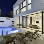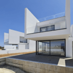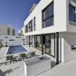 Im Obergeschoss ist ein weiteres Schlafzimmer mit eigenem Balkon und Blick auf den Pool sowie einem angrenzenden Badezimmer. Zwei weitere Schlafzimmer teilen sich ein Familienbad. Über eine Außentreppe ist der große Dachgarten zu begehen, der mit einem Grill und einer Bar ausgestattet ist.