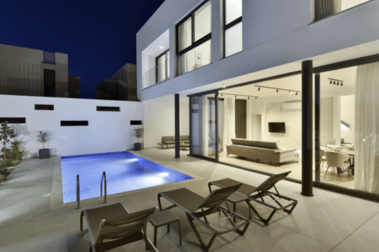 Die Villa verfügt über einen geräumigen, offenen Wohnbereich mit einer voll ausgestatteten, modernen Küche. Im Erdgeschoss befindet sich zudem ein Schlafzimmer mit einem Badezimmer en-Suite.