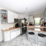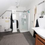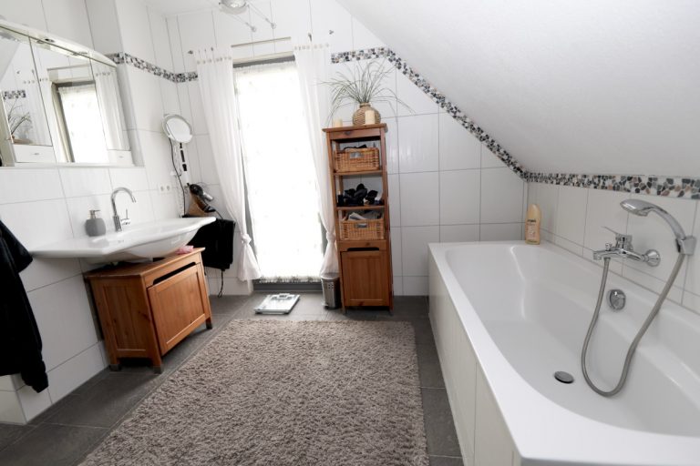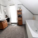In den Wohnräumen im Erdgeschoss sind helle Feinsteinfliesen verlegt worden. Die Wohnräume in den oberen Etagen sind mit pflegeleichtem Laminat und mit Auslegware ausgestattet. Das Badezimmer und die Küche sind modern gefliest.