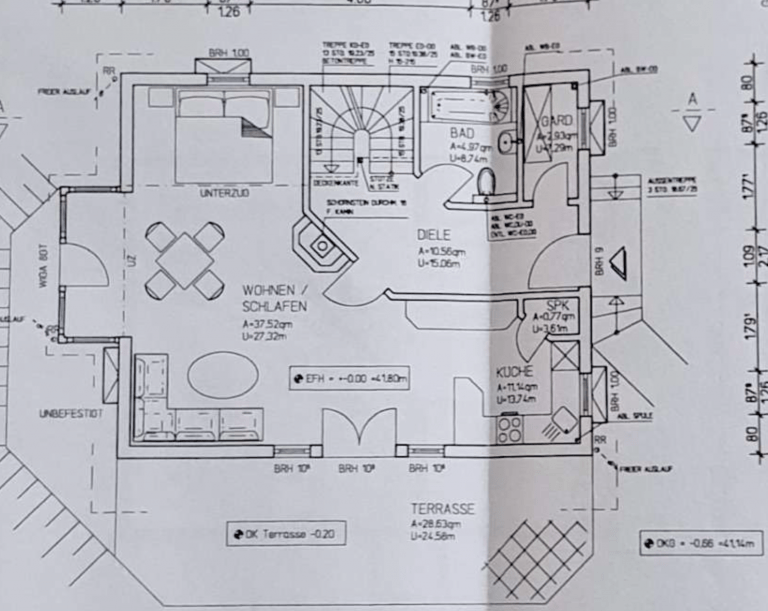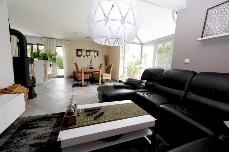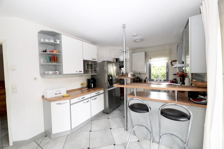 Im Erdgeschoss des Hauses befinden sich der Eingangsbereich, ein geräumiges Gäste-WC, zwei praktische Abstellräume sowie das Herzstück des Hauses: Das großzügige Wohn-/Esszimmer mit Wintergarten und nur einem gemütlichen, drehbaren Kamin für die kalten Winterabende nebst einer offenen Küche, ausgestattet mit einer modernen Einbauküche.