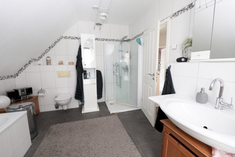 Über eine freitragende Holztreppe ist das Obergeschoss zu erreichen. Hier befinden sich der Flur, drei Schlafzimmer sowie ein großes, tagesbelichtetes Wohlfühl-Badezimmer mit Badewanne und einer separaten Dusche. Der Balkon ist von den beiden nebeneinanderliegenden Schlafzimmern aus jeweils zu begehen.