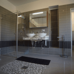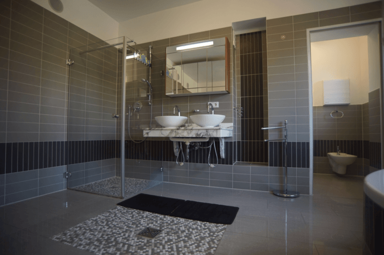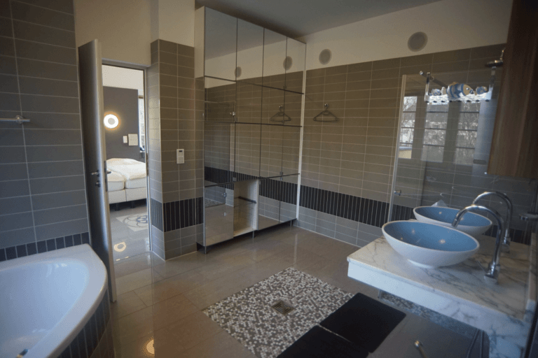 - Entfernung des ursprünglichen Kellerbodens und Neuaufbau des Kellerbodens mit Feuchteschutz, Wärmedämmung, Fußbodenheizung, Estrich und hochwertigen Feinsteinzeugfliesen.
