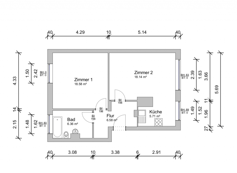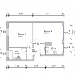 Die Wohnung verfügt über eine Wohnfläche von ca. 55 m², welche sich auf ein Wohnzimmer, ein Schlafzimmer, ein Badezimmer und eine Küche verteilen. Letztere ist mit einer Einbauküche ausgestattet. Das Badezimmer verfügt über eine Badewanne, ist hell gefliest und bietet Platz für die Waschmaschine.