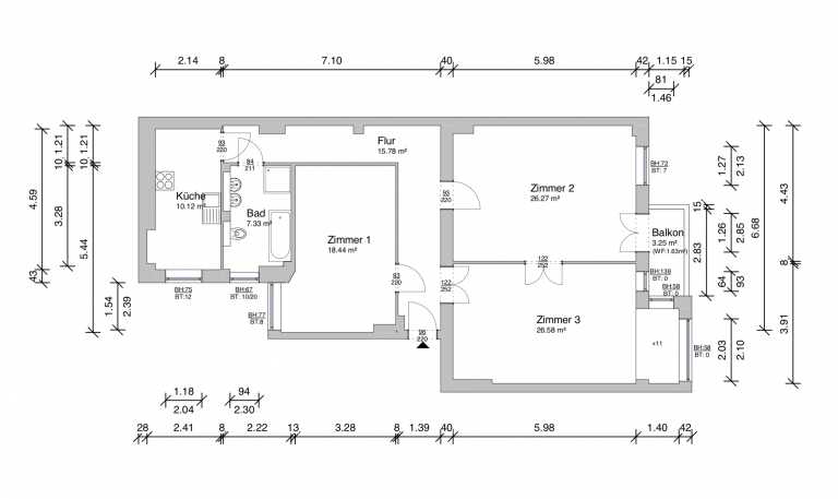 Auf ca. 106 m² Wohnfläche verteilen sich ein zum Hof ausgerichtetes Schlafzimmer und zwei zur Straße ausgerichtete Zimmer, wobei das eine Zimmer über einen Balkon und das andere Zimmer über einen wunderschönen Erker verfügt. Diese beiden Zimmer sind über eine Flügeltür miteinander verbunden. Somit wird ein großzügiges Raumgefühl für einen Wohn-Essbereich vermittelt, oder bei Bedarf auch die Privatsphäre für ein zweites Schlafzimmer geboten.