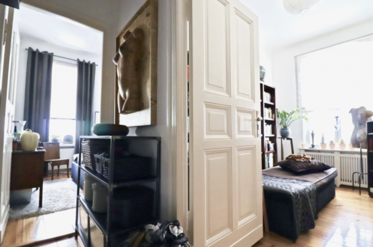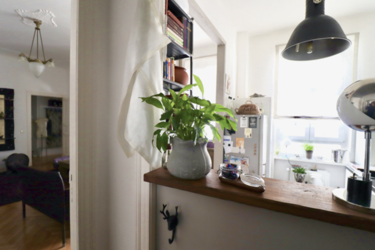 Der Eingangsbereich bietet Platz für die Garderobe. Die Küche ist zur rechten Seite gelegen und nur durch einen Tresen abgetrennt vom Flur, eine sehr geschickte Grundriss-Lösung. Der Flur führt weiter zum Wohn-/Esszimmer, welches den Zugang zur hochwertig ausgestatteten Küche ermöglicht, und welches durch eine Flügeltür mit einem weiteren Zimmer verbunden ist, welches aktuell als Arbeits-/Gästezimmer genutzt wird. Insgesamt wirkt die Wohnung dadurch sehr offen und großzügig.