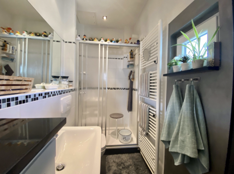 Vom Wohn-/Esszimmer und auch vom Arbeits-/Gästezimmer ist der Zugang zu einem weiteren Flur gegeben, um einerseits das Badezimmer und andererseits das Schlafzimmer zu erreichen. Das Badezimmer verfügt über ein Fenster und ist ausgestattet mit einer großen Dusche sowie einem praktischen Handtuchwärmer. Die Waschmaschine ist in der Küche untergebracht. Das Schlafzimmer hat eine praktische Unterteilung durch eine eingezogene Wand, so dass eine begehbarer Ankleidebereich zur Verfügung steht.