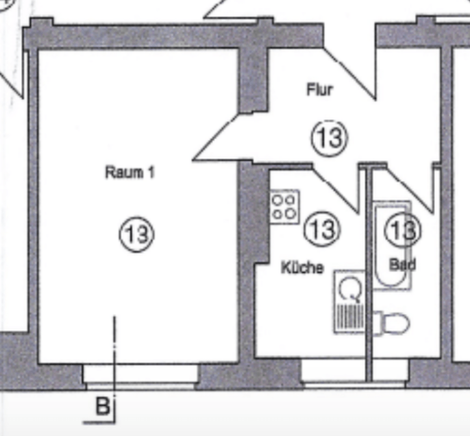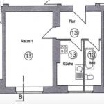 Das Wohnhaus ist in ein Vorderhaus und in ein Hinterhaus aufgeteilt. Die Wohnung befindet sich im 4. OG des Vorderhauses und verfügt über ca. 41 m², die sich auf ein Zimmer, eine Küche und das Bad verteilen.