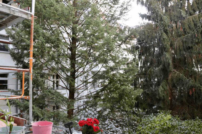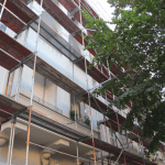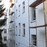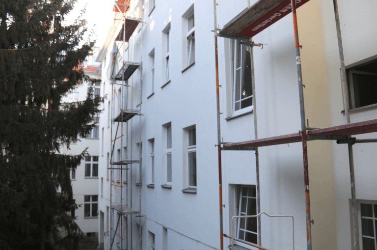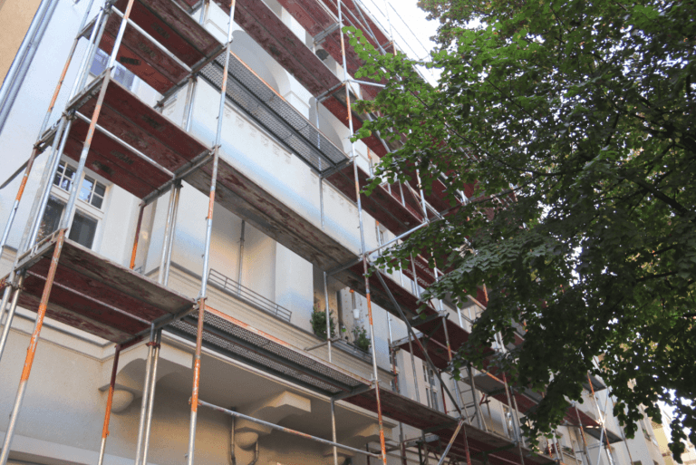 Die Fassade wird aktuell saniert, die Dachgeschosse werden ausgebaut und ein Fahrstuhl wird ans Treppenhaus angesetzt.