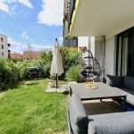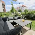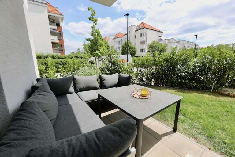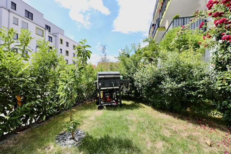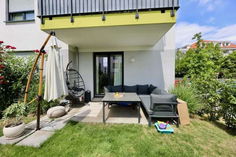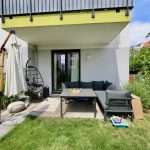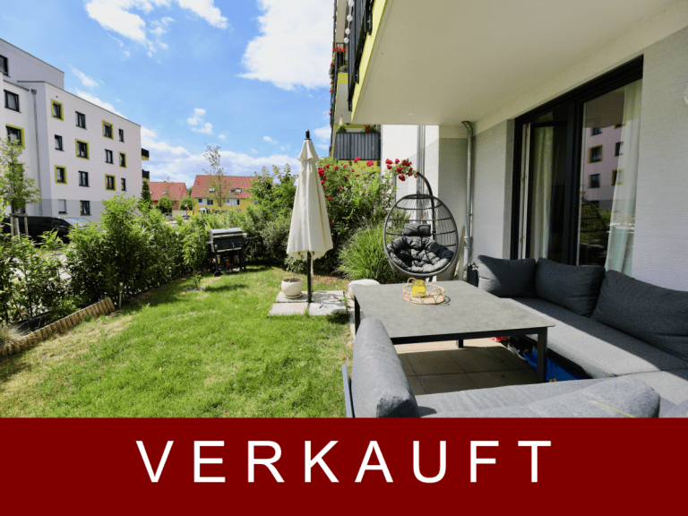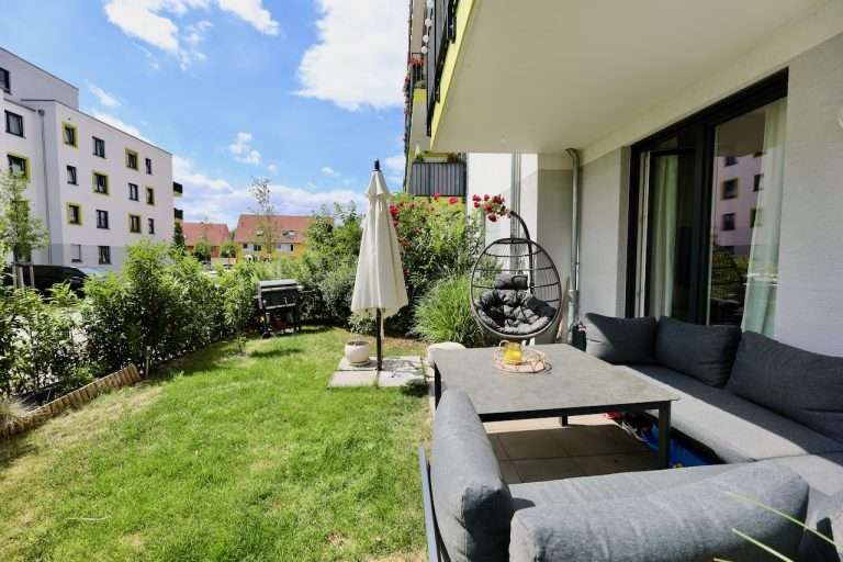 Die neuwertige Erdgeschosswohnung verfügt über eine Wohnfläche von ca. 74,37 m², welche sich auf einen Flur, zwei Schlafzimmer, ein tagesbelichtetes Badezimmer mit Badewanne und einer bodentiefer Dusche sowie auf eine Küche, die mit einer modernen Einbauküche mit hochwertigen Markengeräten ausgestattet ist, verteilt. Neben der Küche befindet sich das Wohnzimmer, und bei Bedarf könnte hier ein Durchbruch erstellt werden, um einen Wohnbereich mit offener Küche zu schaffen. Vom Wohnzimmer aus ist die sonnige Süd-Terrasse zugänglich sowie der Gartenanteil.