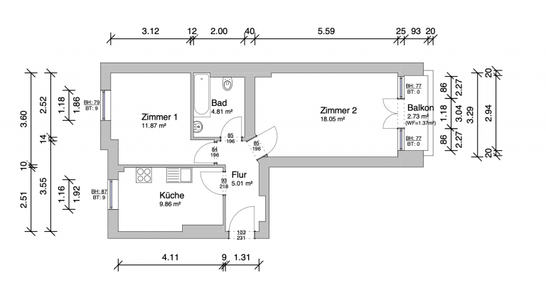 Auf ca. 51m² verteilen sich ein Flur, zwei Zimmer, eine Küche und ein Badezimmer, ausgestattet mit einer Badewanne. Zudem verfügt die Wohnung über einen südöstlich ausgerichteten Balkon.