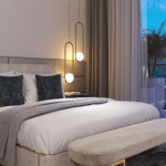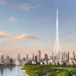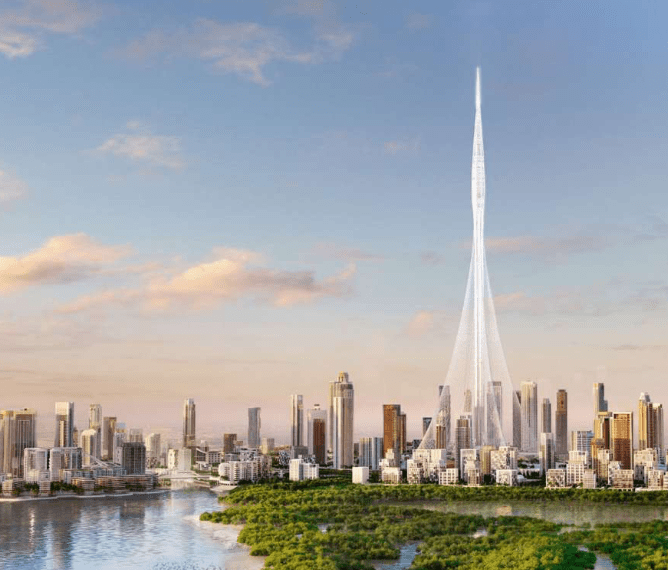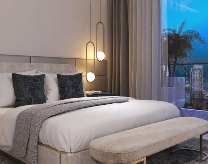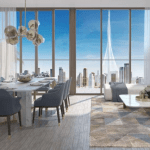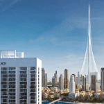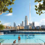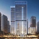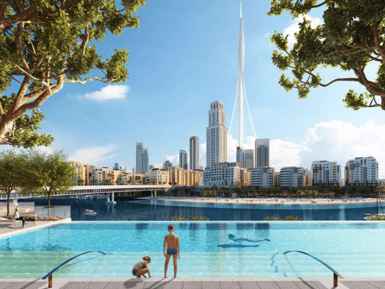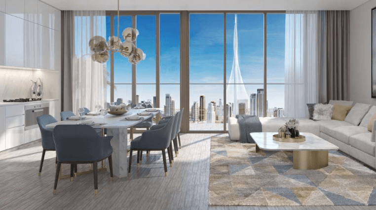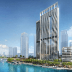 Dieses neue architektonische Wahrzeichen an der Promenade von Creek Island Dubai mit Blick auf den Dubai Creek Tower besteht aus zwei modernen, 44-stöckigen Türmen, welche sich im Zentrum Dubais befnden.