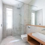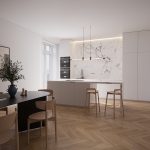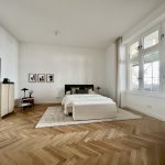 Fischgrätparkett. Badausstattung von Duravit und Grohe, mit italienischen Feinsteinfliesen. Die detaillierten technischen Elemente stehen im Einklang mit der feinen Ästhetik.