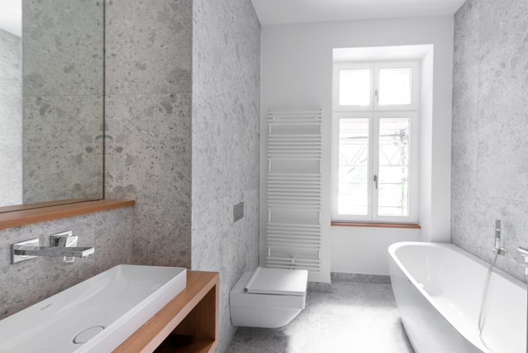Die Bäder beeindrucken mit einer erstklassigen Grundausstattung. In den Bädern sind großflächige Fliesen sowie Ausstattung und Armaturen der renommierten Hersteller Duravit, Hoesch und Hans Grohe verbaut. Einzelne Holzdetails schaffen eine Verbindung zwischen den klaren Linien der Bäder und den feinen traditionellen Details der anderen Räume.