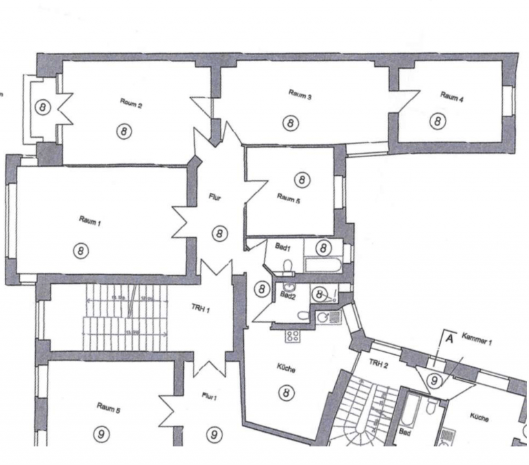 Die Wohnung befindet sich im zweiten Obergeschoss und verfügt über ca. 151,79 m², die sich auf fünf Zimmer, die Küche sowie ein tagesbelichtetes Wannenbad und ein tagesbelichtetes Duschbad verteilen.
