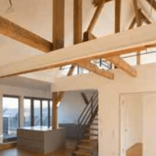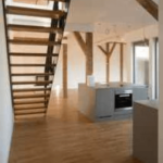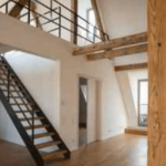 Der Innenausbau gestaltet sich modern und zurückhaltend, das Herz der Wohnung: Die ca. 90 m² große Wohn-/Essküche mit einem gemütlichen Kamin. Es ergibt sich eine Raumhöhe von bis zu 7 m hoher Deckenhöhe; die freigelegten Holzbalken geben dem Raum einen warmen Rahmen.