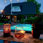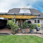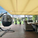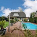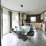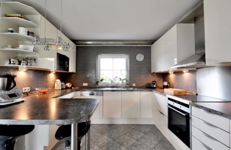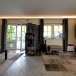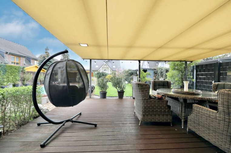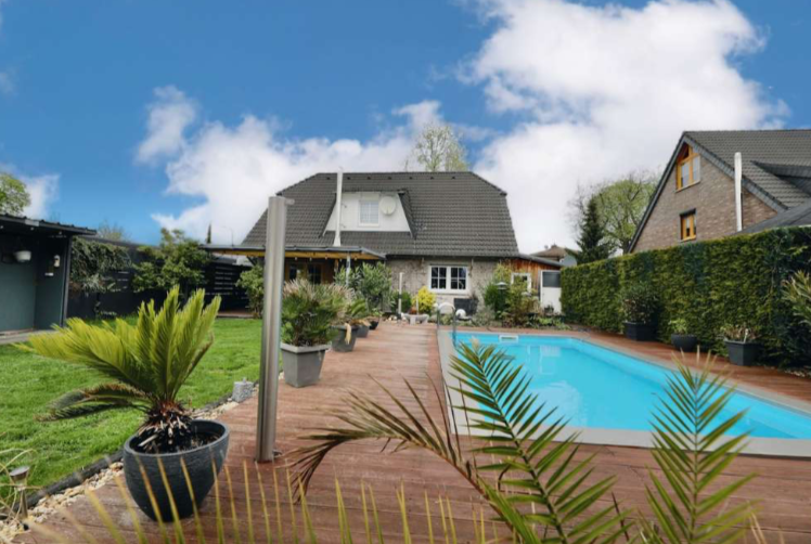 Im Erdgeschoss befindet sich ein Eingangsbereich mit Platz für die Garderobe, ein Duschbad, ein Hauswirtschaftsraum, ein Arbeits-/Gästezimmer sowie ein großzügiges Wohn-/Esszimmer mit einem Kamin und einer offenen Küche, ausgestattet mit einer hochwertigen Einbauküche. Vom Wohnzimmer ist der Zugang zur großflächigen, überdachten Terrasse gegeben. Der schön angelegte Garten ist recht pflegeleicht dank eines versenkbaren Rasensprengers und eines Rasenroboters. Der Pool spricht für sich - urlauben im eigenen Garten! Und eine weitere überdachte Terrasse bietet einen gemütlichen Lounge-Bereich.