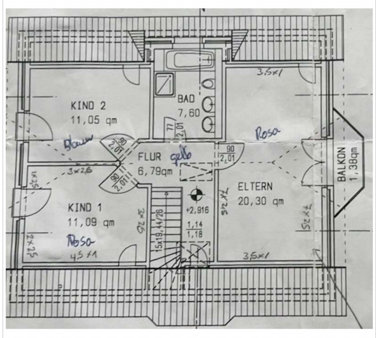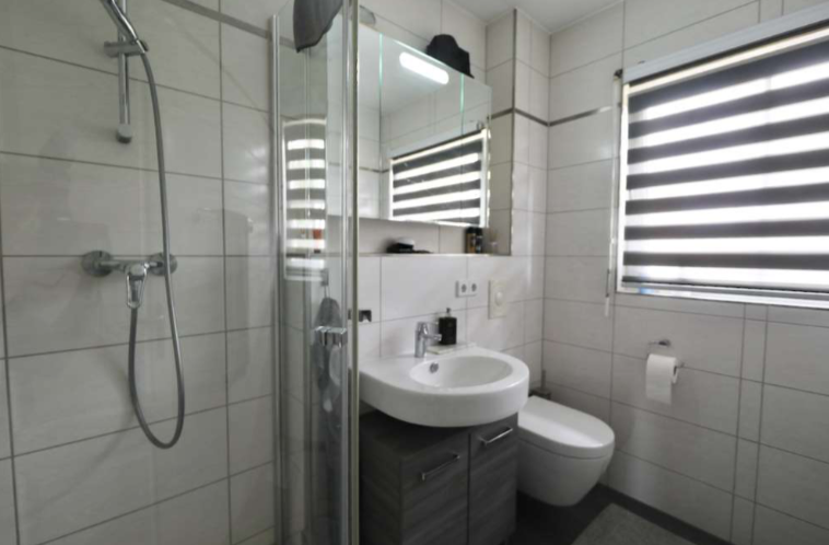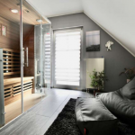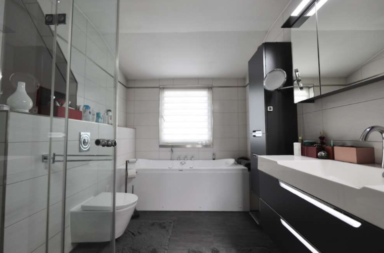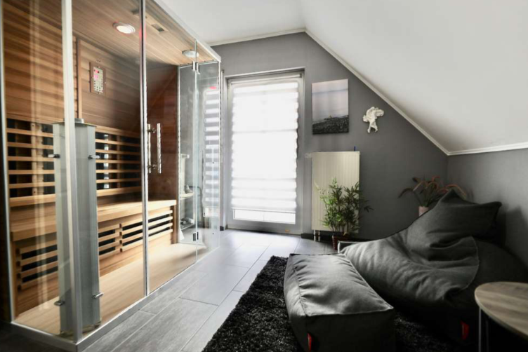 Vom Eingangsbereich im Haus ist über eine Holztreppe das obere Geschoss zu begehen. Hier befinden sich ein Flur, drei weitere Zimmer, eines davon mit begehbarem Ankleidebereich und mit Balkon, ein Badezimmer, ausgestattet mit einer Badewanne mit Whirlpool-Funktion sowie einer separaten Dusche. Zum danebenliegenden Zimmer wurde vom Badezimmer ein Durchgang geschaffen, um einen wunderschönen Wellnessbereich zu erschaffen - mit einer Infrarot-Sauna und einem Ruhebereich zum Entspannen.