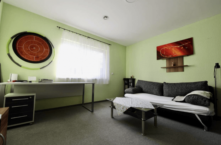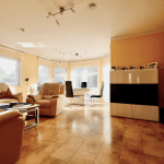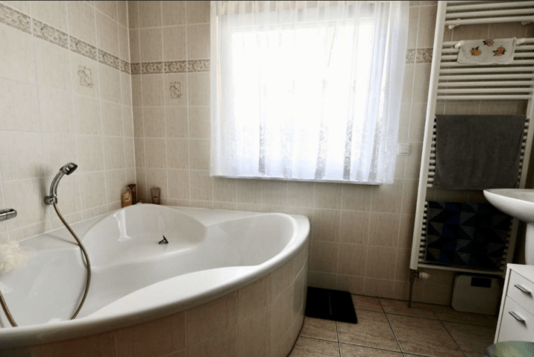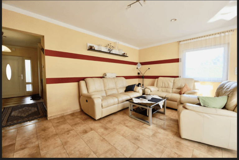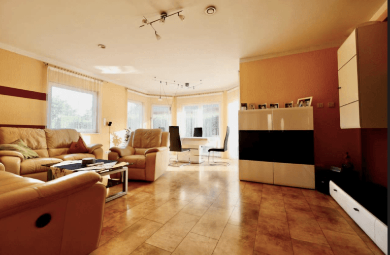 Im Wohnzimmer ist ein pflegeleichter Laminatboden in Fliesenoptik und in den restlichen Wohnräumen ist Auslegware verlegt. Die Küche, das Badezimmer und das Gäste-WC sind gefliest. Auch der Eingangsbereich und der Flur sind mit einem Fliesenboden ausgestattet.