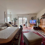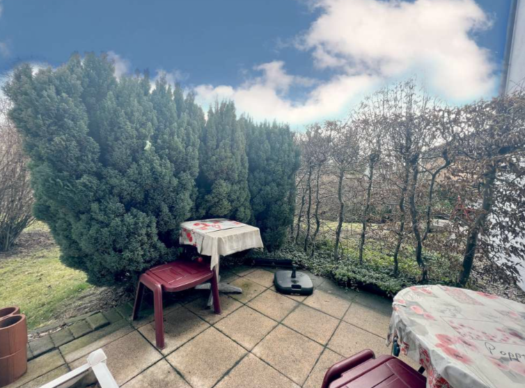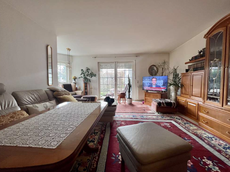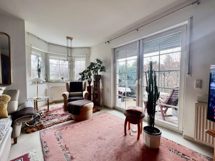 Das geräumige Wohnzimmer hat direkten Zugang zu der großzügigen Terrasse mit Gartenanteil. Hier besteht ein Sondernutzungsrecht - herrlich grün!
