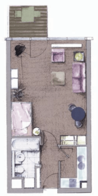 Auf einer Wohnfläche von ca. 39,20 m² verteilen sich ein Flur, ein Wannenbad mit Waschmaschinen-Anschluss, eine Küche inklusive Einbauküche und ein Wohnraum mit integrierter Schlafnische.