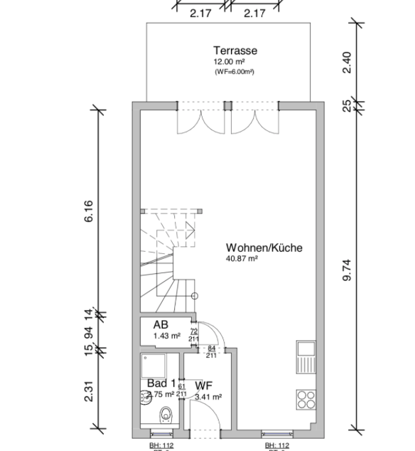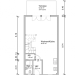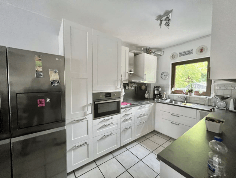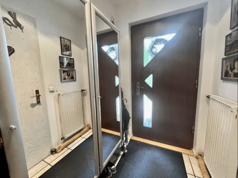 Im Erdgeschoss des Hauses sind der Eingangsbereich, ein Duschbad, eine Küche, ausgestattet mit einer Einbauküche, eine kleine Abstellkammer und das Wohnzimmer mit einer Essecke untergebracht. Die Küche ist zum Wohnzimmer offen gehalten und wurde vor ca. 6 Jahren erneuert.