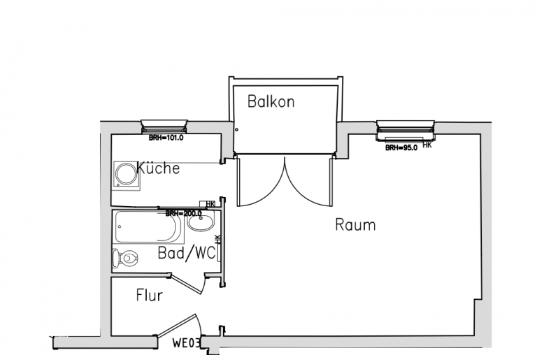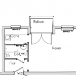Diese verteilt sich auf einen Flur; eine Küche; ein Badezimmer, ausgestattet mit einer Badewanne; ein westlich ausgerichtetes Zimmer mit Zugang zum Balkon, der ruhig zum Innenhof gelegen ist.