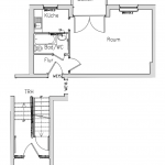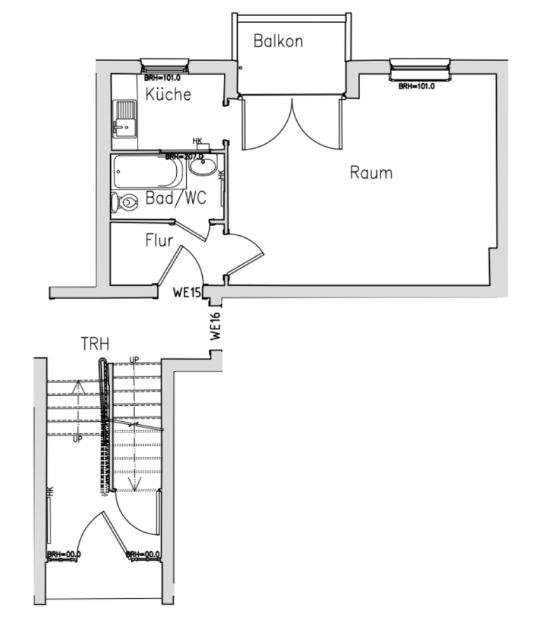 Diese verteilt sich auf einen Flur; eine Küche; ein Badezimmer, ausgestattet mit einer Badewanne; ein westlich ausgerichtetes Zimmer mit Zugang zum Balkon, der ruhig zum Innenhof gelegen ist.