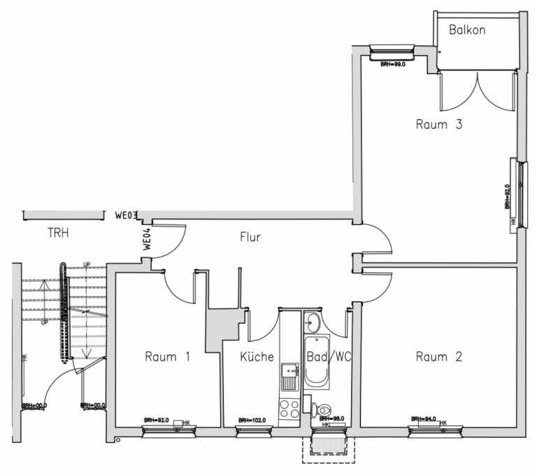 Diese verteilt sich auf einen Flur, eine Küche, ein Badezimmer mit Badewanne, ein westlich ausgerichtetes Zimmer mit Zugang zum Balkon, der ruhig zum Innenhof gelegen ist, als auch zwei weitere Zimmer.